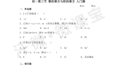 初一第3节 幂的乘方与积的乘方 入门测