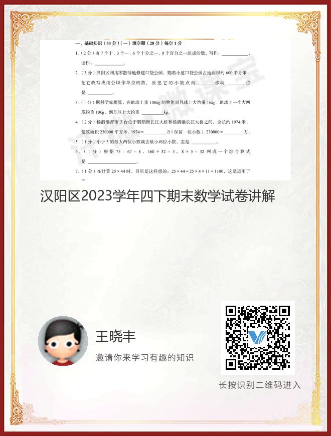 正在播放:汉阳区2023学年四下期末数学试卷讲解