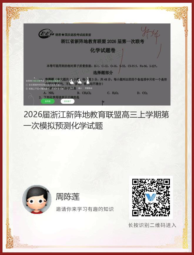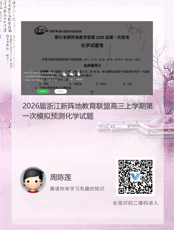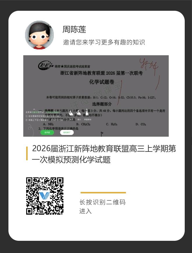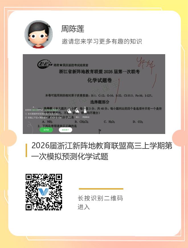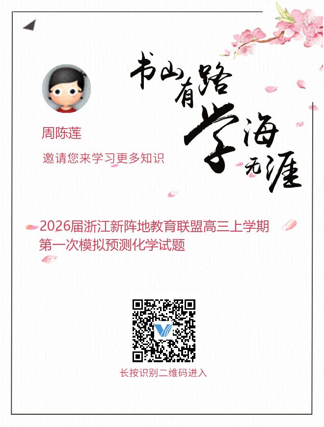 正在播放:2026届浙江新阵地教育联盟高三上学期第一次模拟预测化学试题