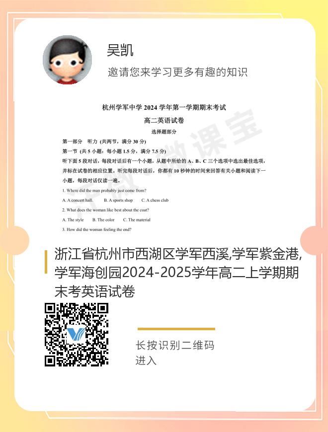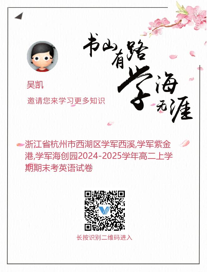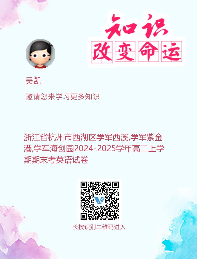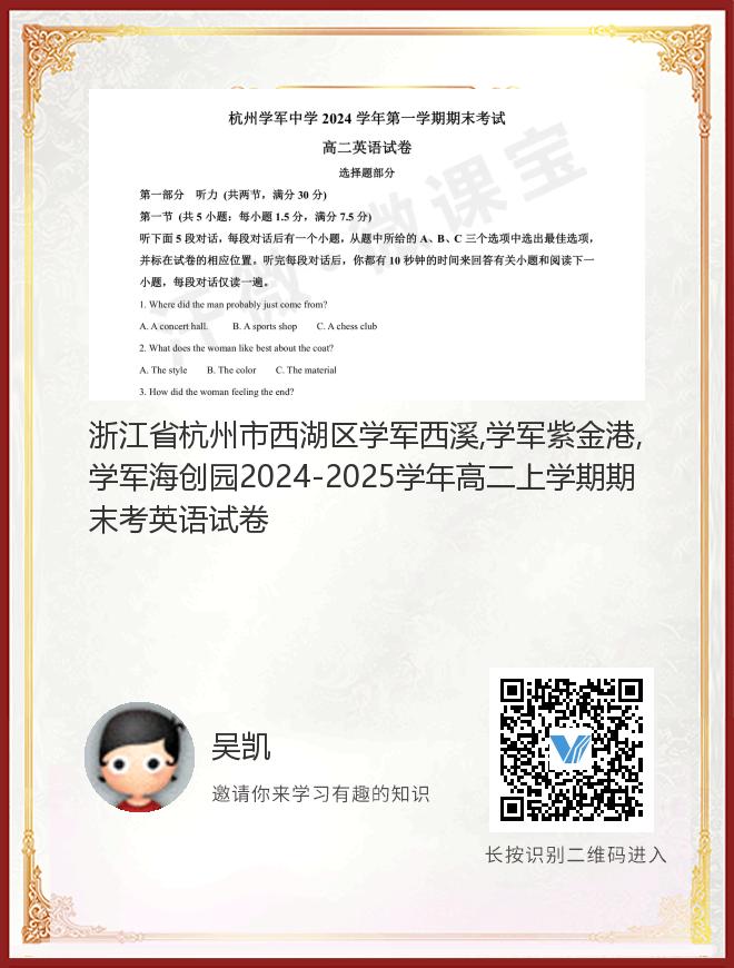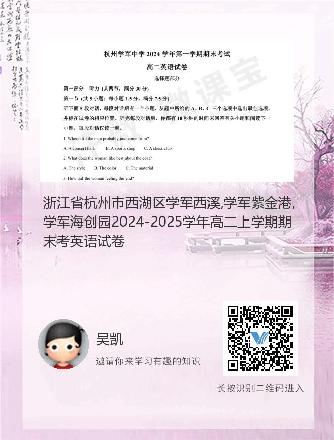 正在播放:浙江省杭州市西湖区学军西溪,学军紫金港,学军海创园2024-2025学年高二上学期期末考英语试卷