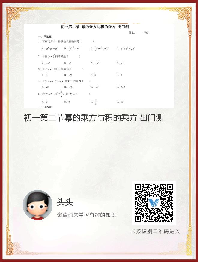 正在播放:初一第二节幂的乘方与积的乘方 出门测