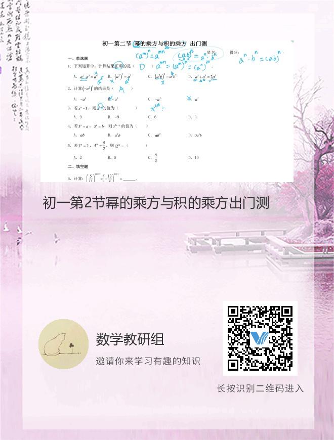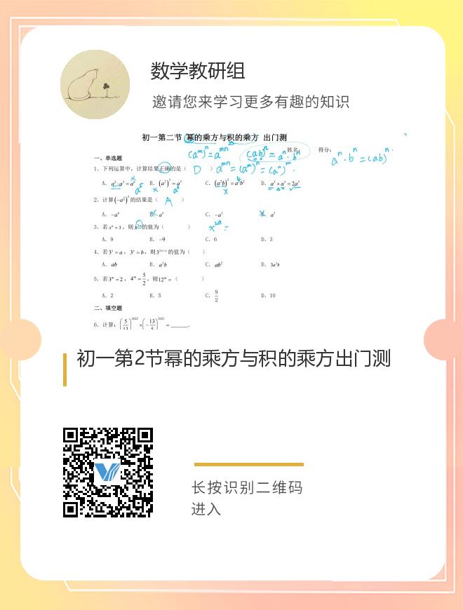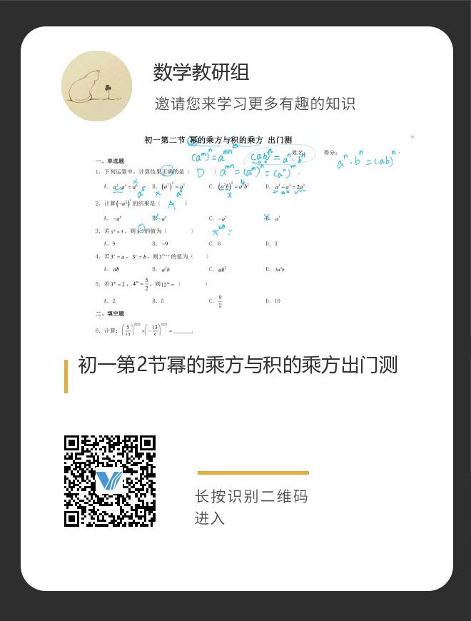 正在播放:初一第2节幂的乘方与积的乘方出门测